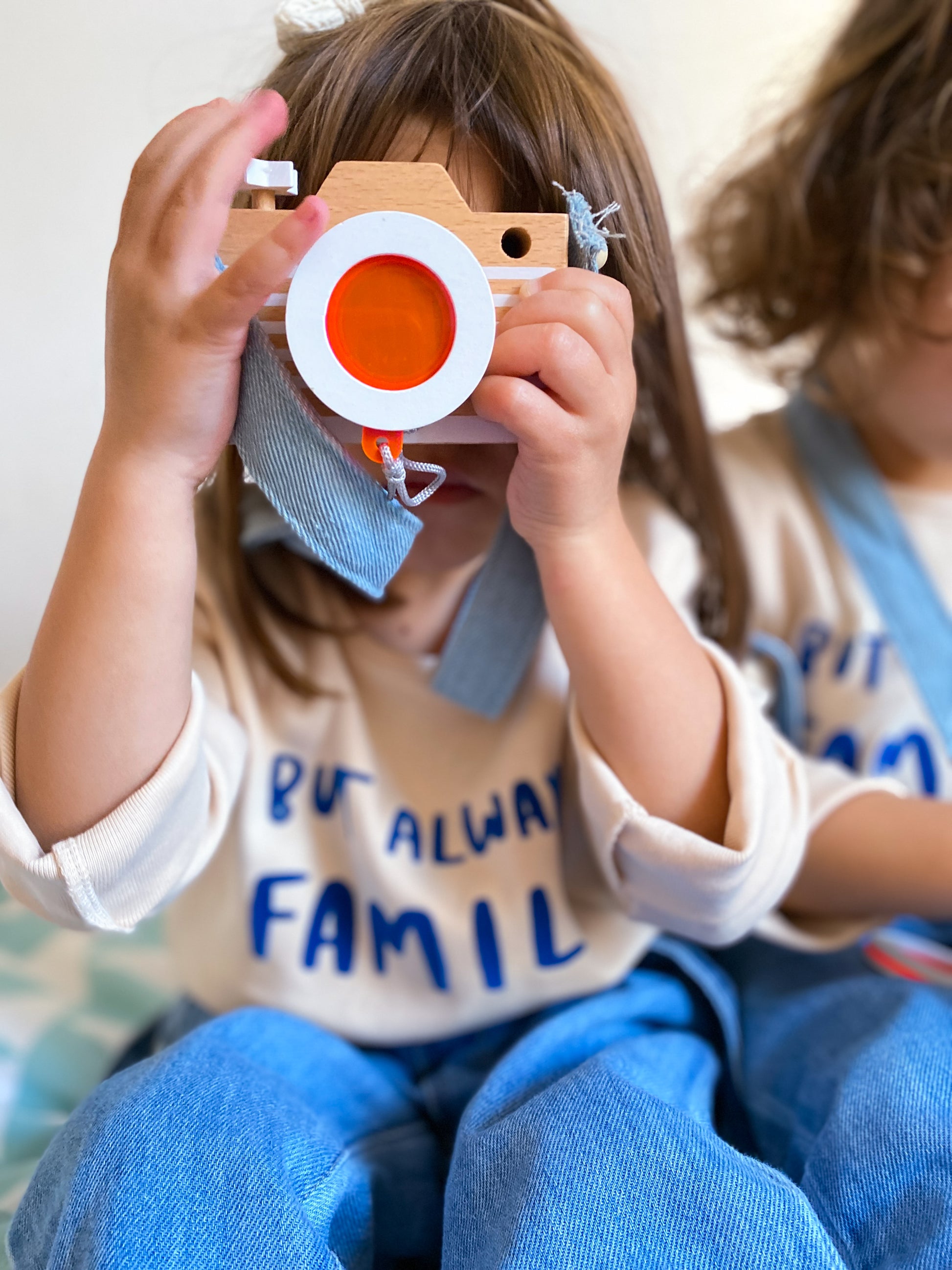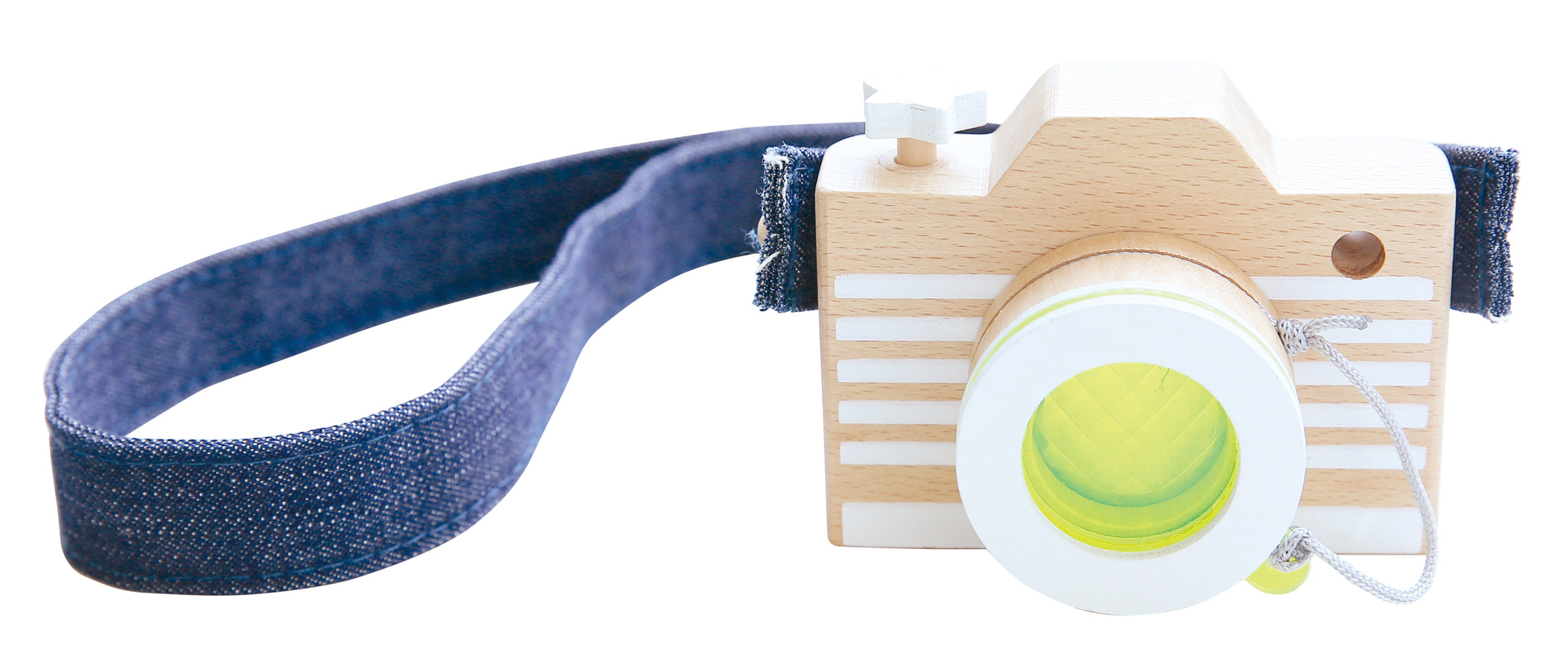 Esta cámara de juguete con lente giratorio y caleidoscopio incluido viene con dos correas intercambiables para que los niños puedan colgarla cómodamente en el cuello.