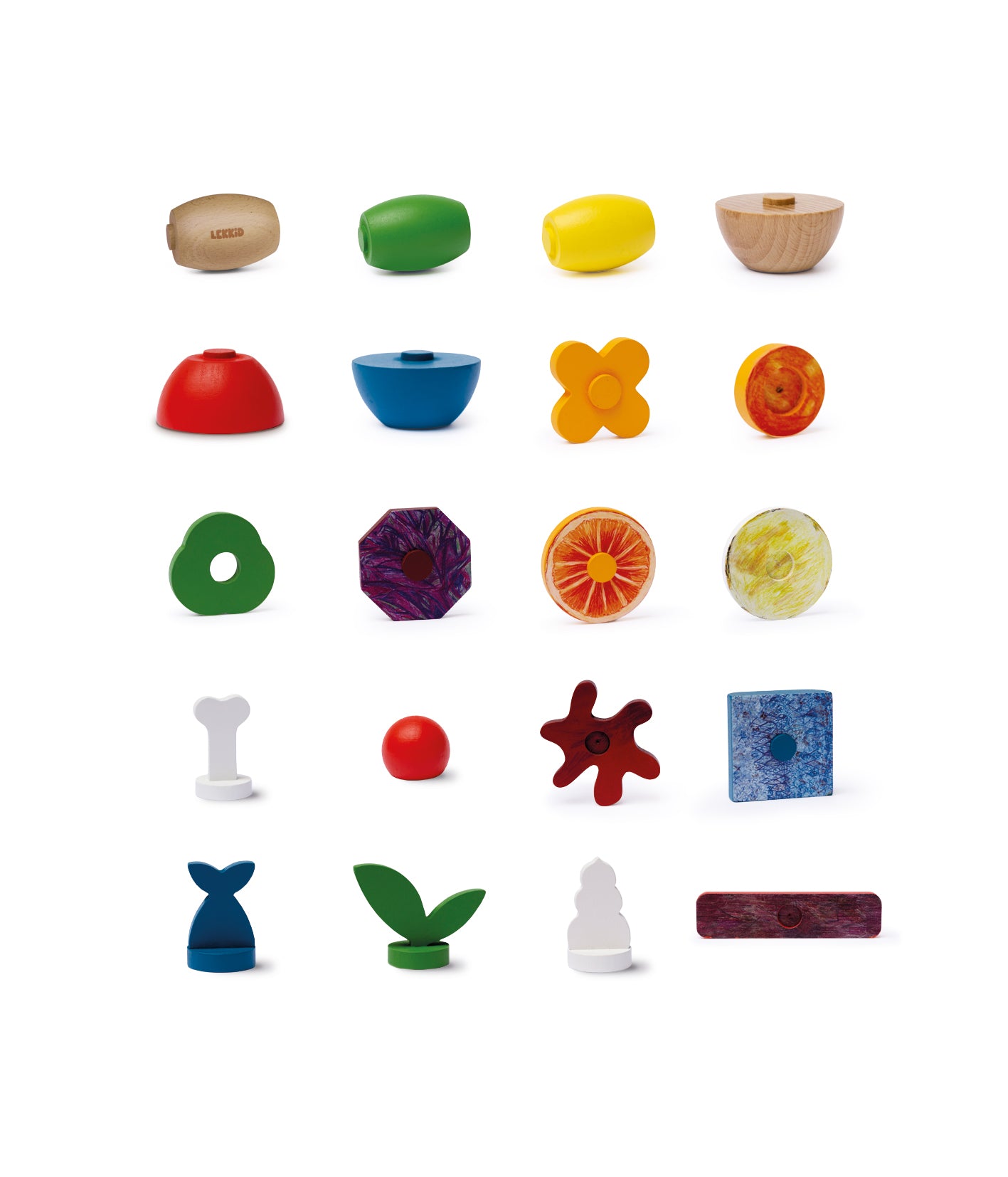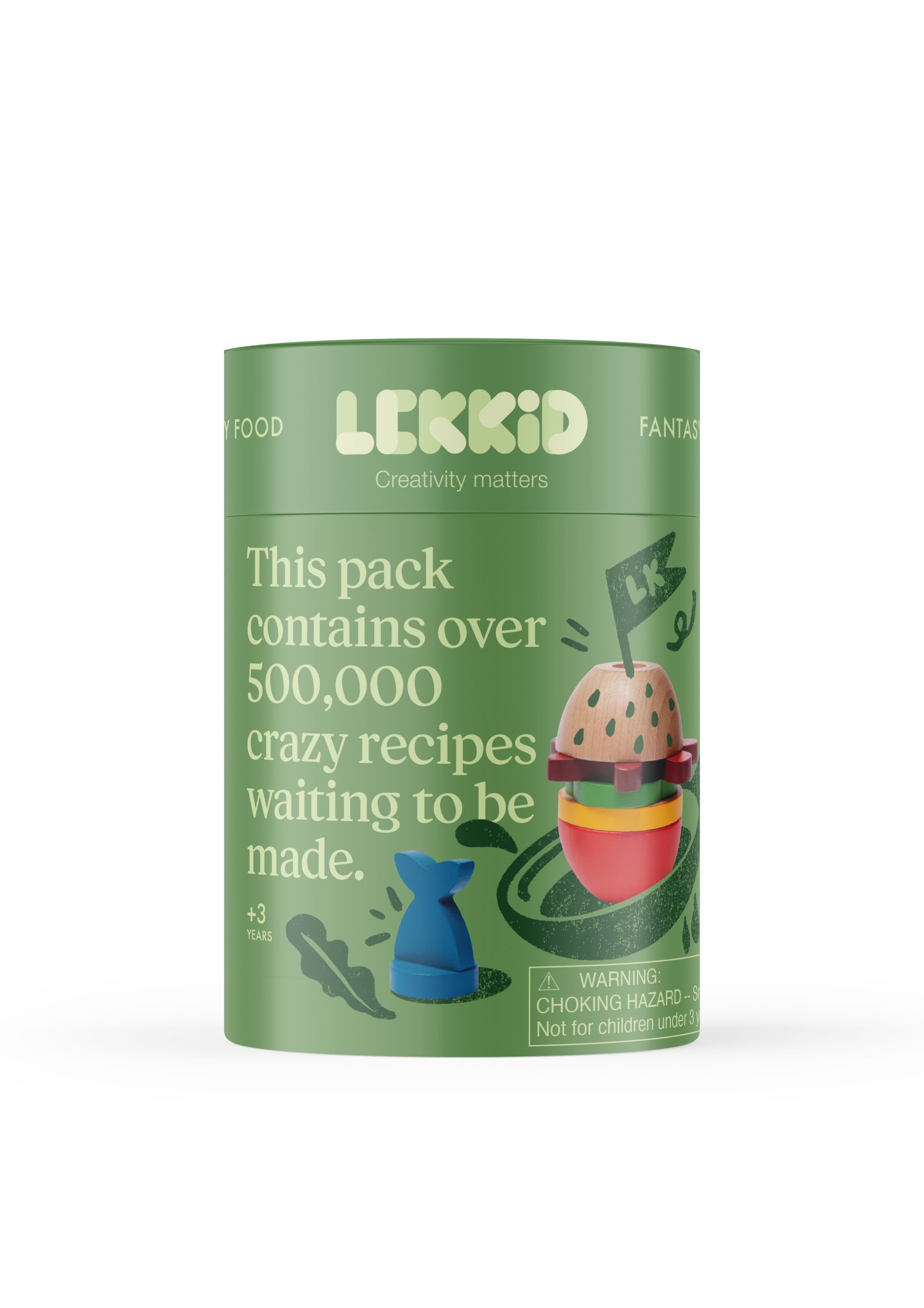Fantasy Food es un divertido juego de construcción con 20 piezas de madera que permite a los niños diseñar sus propias recetas y comidas.