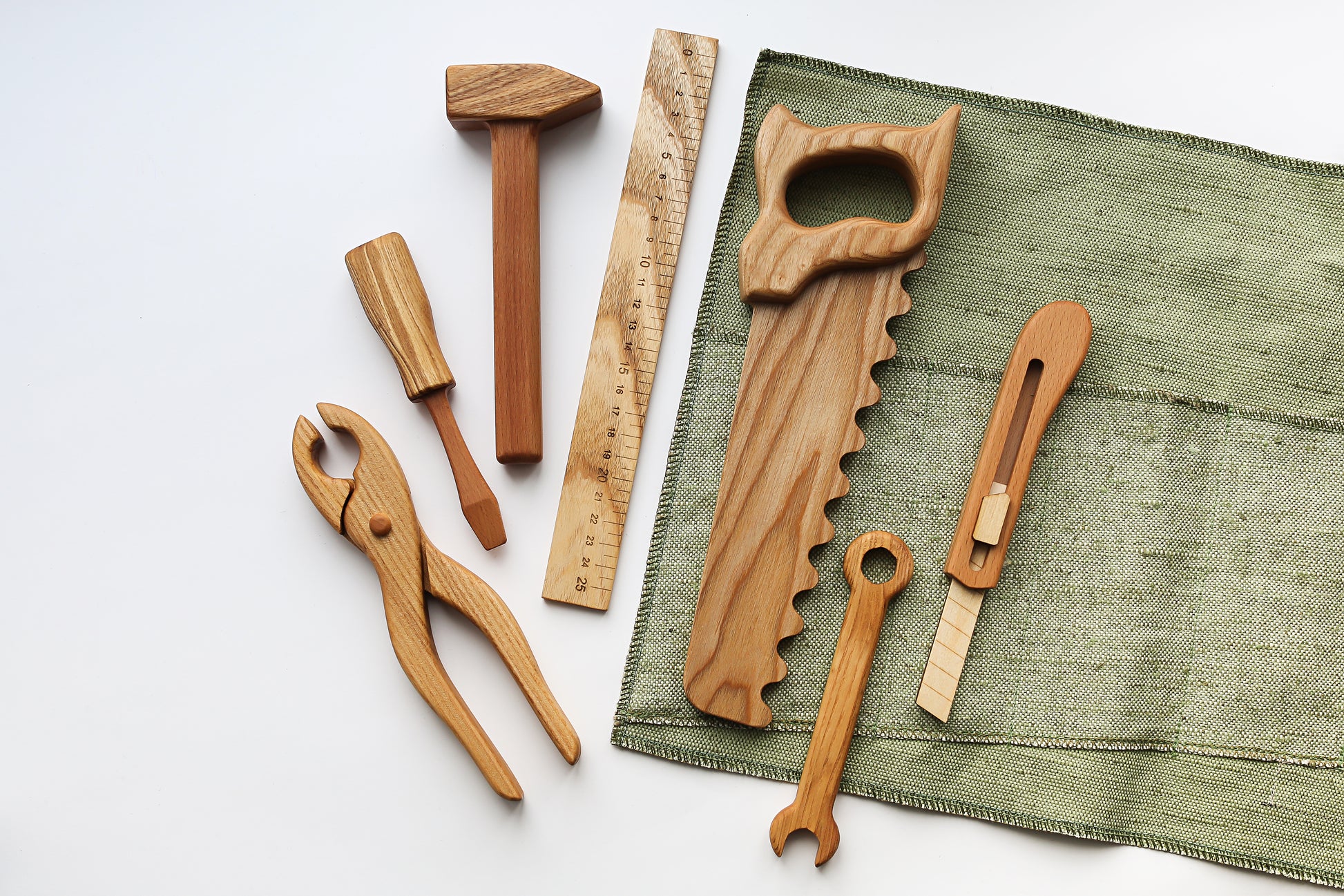 Nuestro set de herramientas de madera, hecho de fresno y haya, es perfecto para futuros constructores. Incluye 7 piezas de madera, como sierra, martillo, alicates y más, recubiertas con aceite natural de Biofa para mayor seguridad.