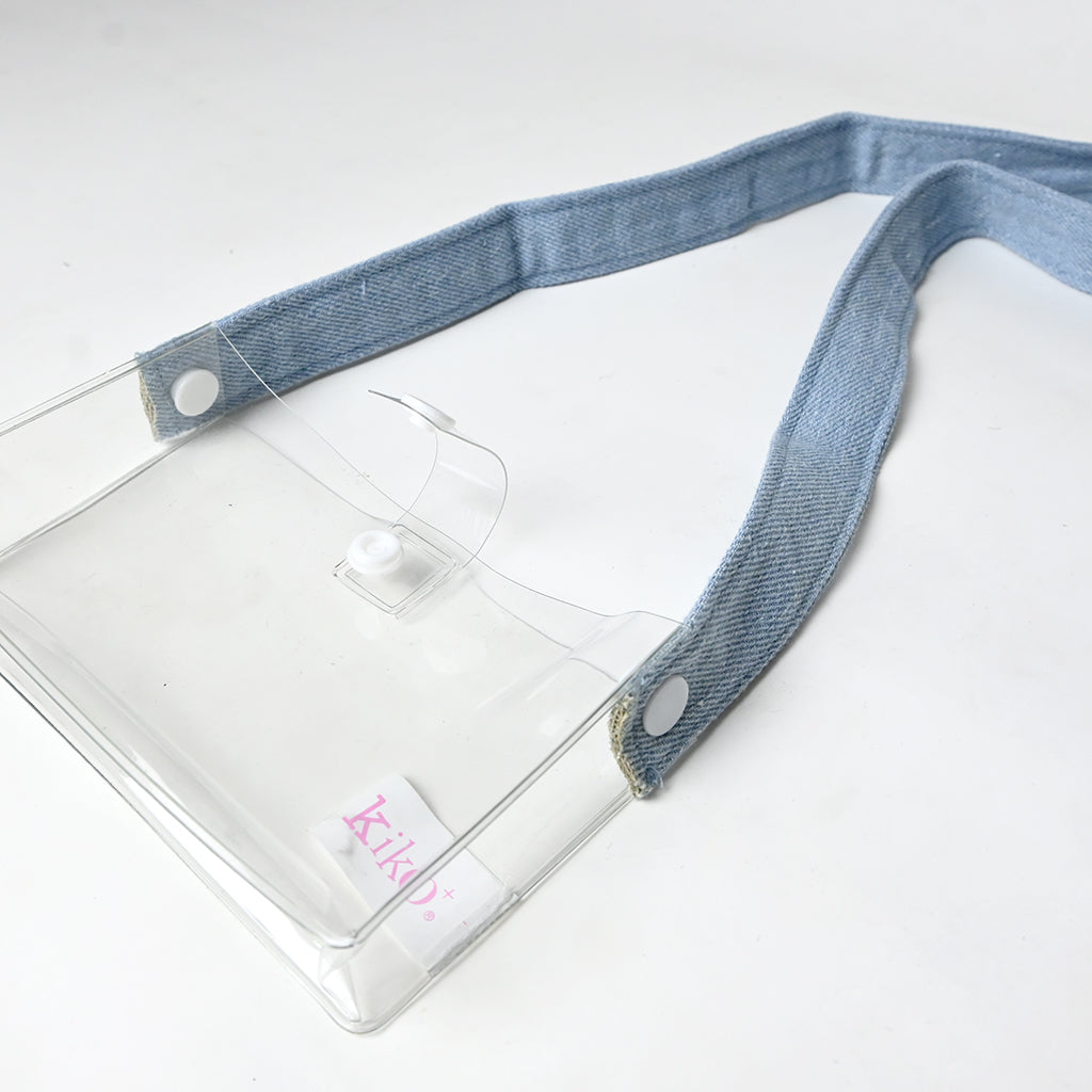 Incluye una funda de plastico transparente con correa de mezclilla para guardar y llevar a cualquier parte.