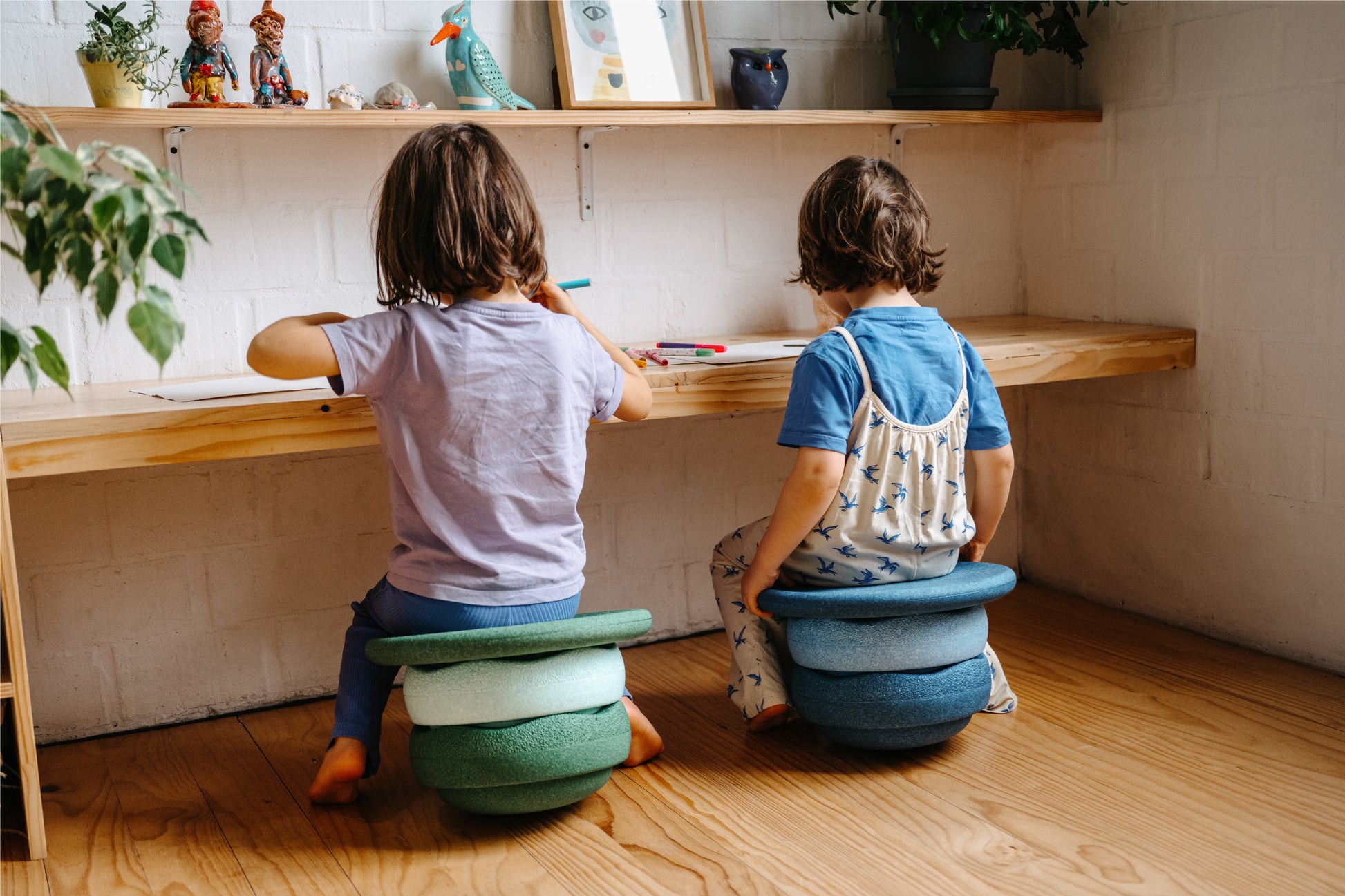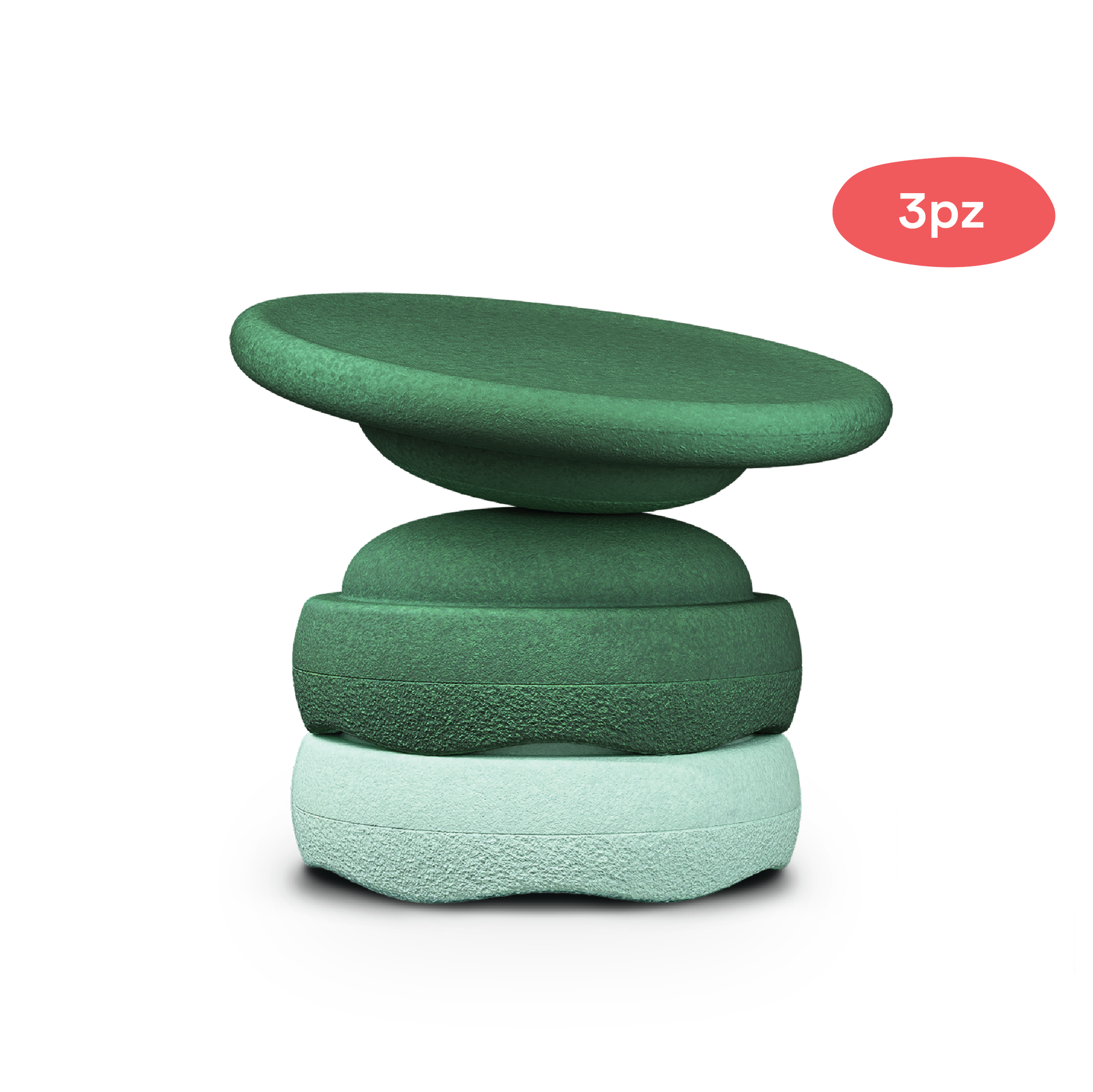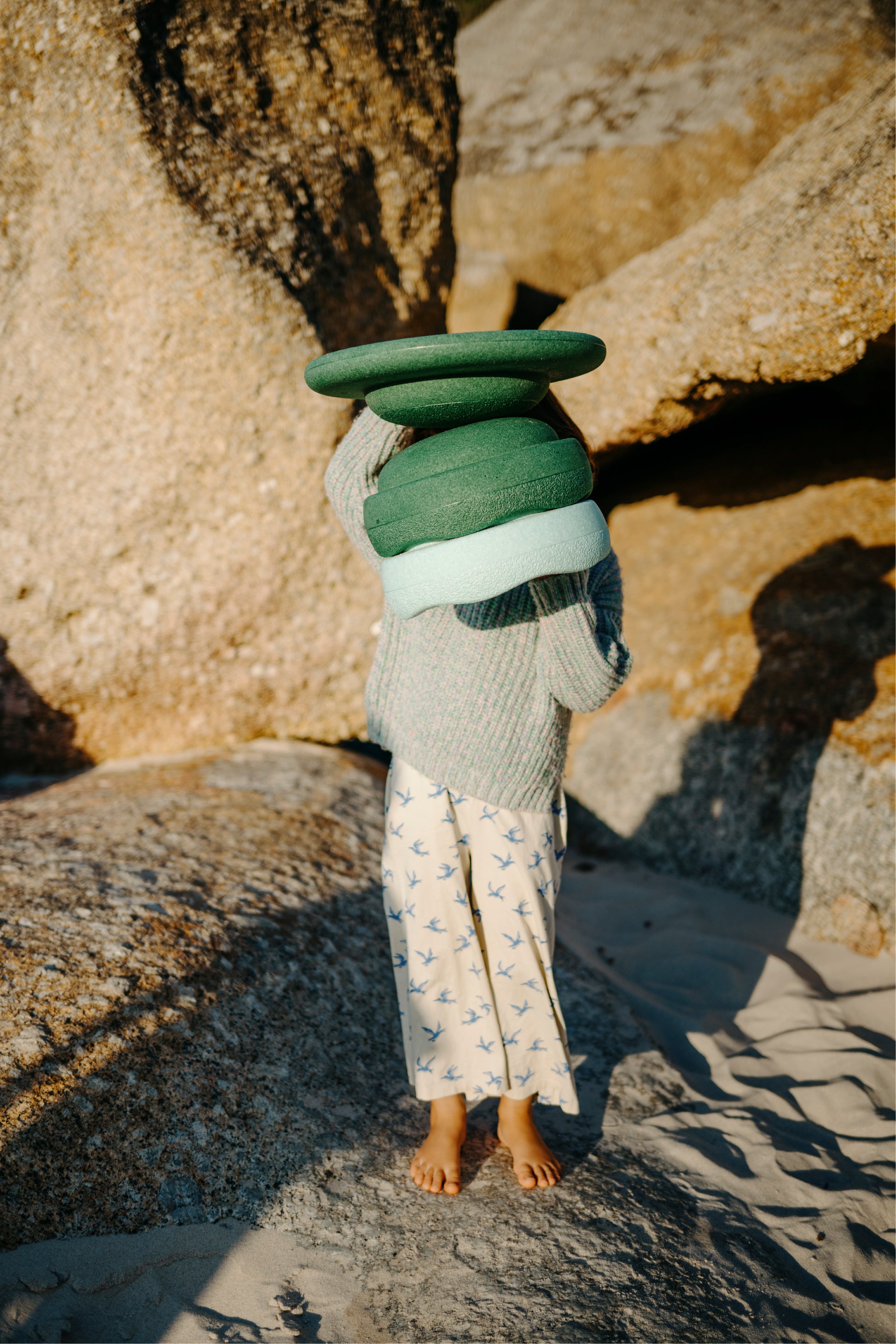 El set Waters & Greens de Stapelstein incluye dos piezas Original y una Board en tonos azul y verde oscuro, inspirados en el agua y la naturaleza. Es perfecto para que los niños salten, apilen, giren o practiquen equilibrio mientras se divierten. Su diseño ligero y resistente permite usarlo en interiores o exteriores, fomentando el movimiento y la imaginación.